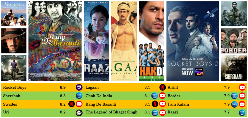 Growing up, Independence Day wouldn’t be complete without watching Border on cable TV. Today, of course, OTT has replaced cable, and Border is far from the only option. The below infographic lists the highest-rated patriotic movies available on OTT in India according to IMDB and Rotten Tomatoes. While not all of the recommendations below are based on true events, all of them are guaranteed to make your chest swell with patriotic pride.